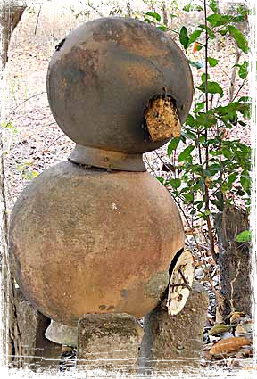 Ein Imker bei Kampala zeigt stolz seine Keramikkrüge, in denen schon seit Vater geimkert hat - eine durchaus übliche Vorgehensweise in diesem Teil Afrikas. Auch er "räuchert" eine Woche lang mit brennendem Kuhdung und abschließend noch mit bestimmten Blättern diese Bienenwohnungen aus. Dann sind sie bereit, damit wilde Bienenvölker einziehen können.
